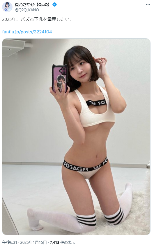 ゲームロックアイドル『ニーキューオメガ』の黒髪ボブメンバーで、ゲーマー&ストリーマーの夏乃さやか(25)が、2025年1月15日、自身のX(旧Twitter)を更新。「2025年、バズる下乳を量産したい。」のコメントとともに、下乳を大胆に見せた下着姿の自撮り写真を投稿すると、ファンから興奮の声が殺到していました。