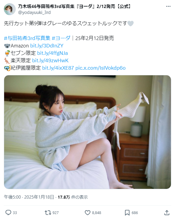 乃木坂46の与田祐希(24)が、2025年2月12日、水着やランジェリー姿を約5年ぶりに披露する3冊目の写真集『ヨーダ』を発売します。
