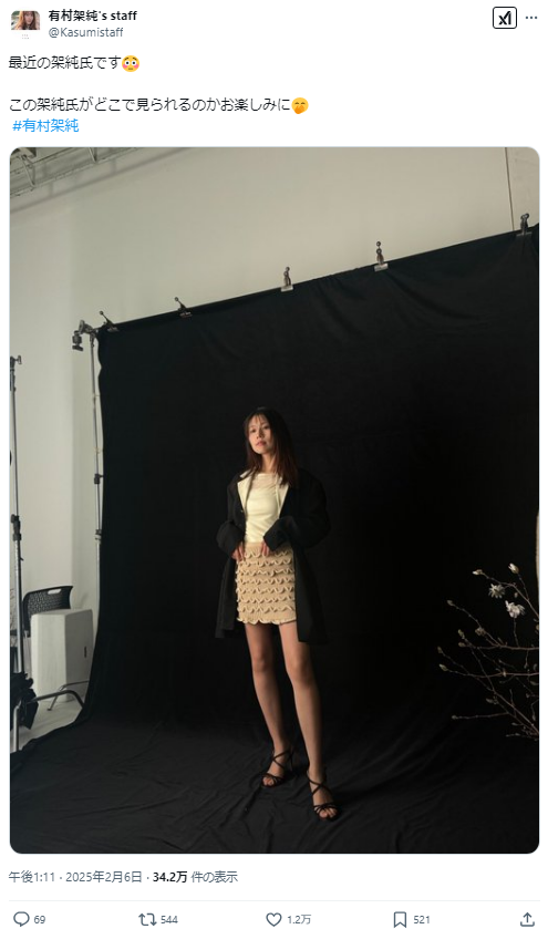 女優の有村架純(31)が、2025年2月6日、マネージャーが更新する公式X(旧Twitter)に登場。「最近の架純氏です😳この架純氏がどこで見られるのかお楽しみに🤭」のコメントとともに、超ミニスカートで美脚を大胆に見せたオフショットを投稿すると、ファンから歓喜の声が殺到していました。
