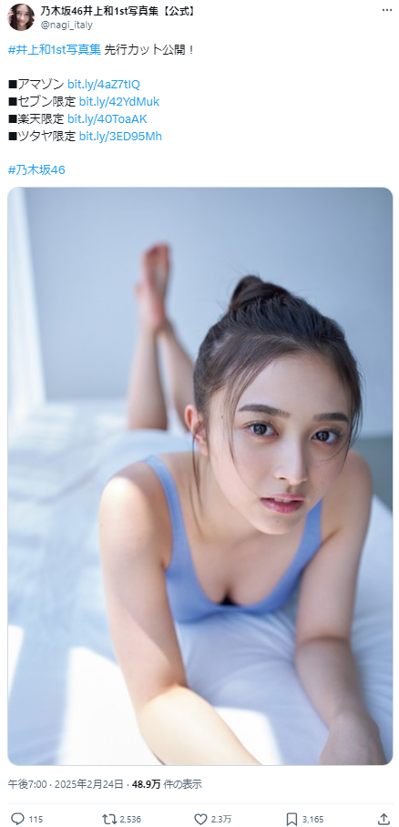乃木坂46の5期生・井上和(いのうえ なぎ=20歳)が、2025年4月22日、水着や初ランジェリーに挑戦した1st写真集を講談社から発売します。