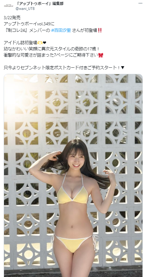 格闘技団体「K-1」の最年少ラウンドガールで、「週刊ヤングジャンプ」主催のオーディション企画「制コレ24」でメンバーに選ばれた百田汐里(しおり=17歳)が、2025年3月22日発売の雑誌「アップトゥボーイ2025年5月号」で、今年初グラビアを披露することがわかりました。