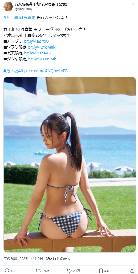 乃木坂46の5期生・井上和(いのうえ なぎ=20歳)が、2025年4月22日、水着や初ランジェリーに挑戦した1st写真集「モノローグ」を講談社から発売します。
