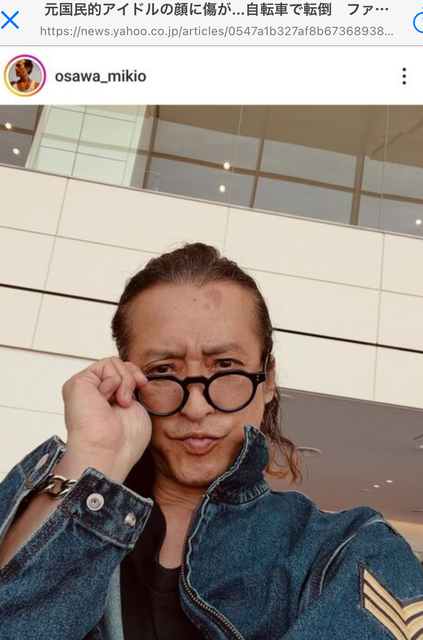 幸い打撲、打ち身のみの軽傷だったが、1週間後に今度は自転車で転倒。「チャリのカゴに水1ケース載せててバランス崩してジャリコンクリートにデコから突っ込んでコケたのよ」といい、モノクロの写真で痛々しい傷がくっきり見える写真も公開した。「あとが残っちゃったけどそのうち消えるでしょう 強烈な2度の大厄落としぢゃ!! 皆んなも自転車に乗る時は自分も周りにも気をつけよう」と前向きに呼びかけた。