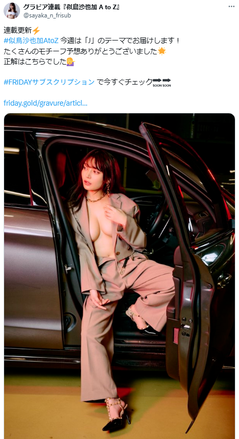 “インスタグラビアの女王”として知られ、インスタフォロワー110万人の似鳥沙也加(にとり・さやか=31歳=Gカップ)が、2025年6月8日、自身の公式X(旧Twitter)を更新。ウェブサイト「FRIDAYサブスクリプション」のグラビア連載「似鳥沙也加 A to Z」から、ノーブラ素肌にジャケットのセクシーショットを投稿すると、ファンから興奮の声が殺到していました。