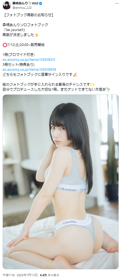 アイドルグループ「#2i2」の最年少メンバー・森嶋あんり(23歳=日韓ハーフ=Eカップ)が、2025年7月11日、自身の公式X(旧Twitter)を更新。ソロフォトブック「be yourself」の再販が決まったことを明かし、カルバン・クラインのTバックランジェリーで美尻を大胆に見せたカットを投稿すると、ファンから興奮の声が殺到していました。