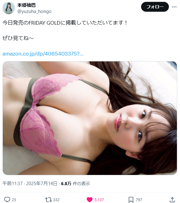 元NMB48で各誌の表紙を席巻する“令和のグラビアクイーン”こと本郷柚巴(22)が、2025年7月14日発売の雑誌「FRIDAY GOLD」で、ランジェリーグラビアを披露しました。