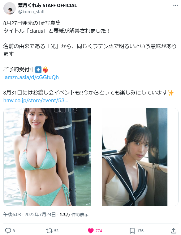 講談社主催のグラビアミス・コンテスト「ミスマガジン2024」でグランプリを受賞したタレントの葉月くれあ(21)が、2025年8月27日、ファースト写真集「clarus」(クラルス)を発売します。