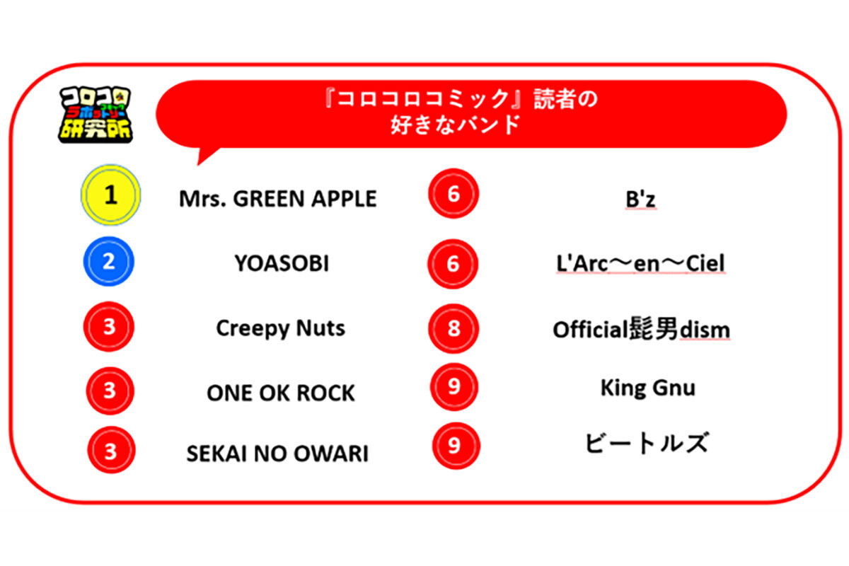 小学館が運営する『月刊コロコロコミック』の読者1000人を対象とした音楽に関するアンケート調査で、小学生の音楽事情が明らかになりました。好きなアーティストランキング1位に輝いたのは「Mrs. GREEN APPLE(ミセス・グリーン・アップル)」。一方で、B’z(ビーズ)やビートルズといった大御所アーティストもトップ10入りを果たし、小学生の音楽の楽しみ方が多様化していることが浮き彫りになりました。