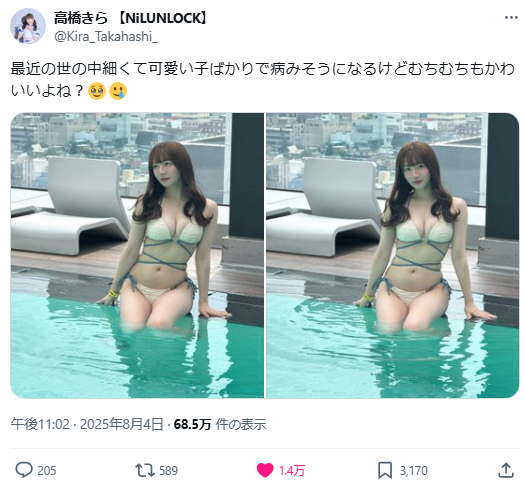 AKB48の元メンバーで、現在はアイドルグループ『NiLUNLOCK』のメンバーとして活動する高橋きら(24)が、2025年8月4日、自身の公式X(旧Twitter)を更新。「最近の世の中細くて可愛い子ばかりで病みそうになるけどむちむちもかわいいよね?」のコメントとともに、プライベートで撮影されたビキニ姿の写真を投稿すると、理想的なむちむちボディに称賛の声が殺到。1万件超の「いいね!」が寄せられていました。