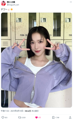 指原莉乃プロデュースの声優ユニット「=LOVE」のメンバー・野口衣織(25)が、2025年8月10日、自身の公式X(旧Twitter)を更新。「デコ~✌」のコメントとともに、へそ出しパーカー姿の写真を投稿すると、5万件超の「いいね!」が寄せられていました。
