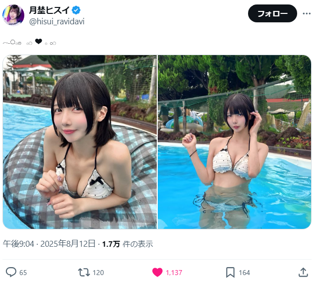 週刊ヤングジャンプに“北半球地下アイドル界最強美少女”と称された、アイドルグループ「RAViDAVi(ラビダビ)」の月埜ヒスイ(つきの・ひすい=年齢非公表)が、2025年8月12日、自身の公式X(旧Twitter)を更新。プライベートで訪れたプールでの水着ショットを投稿すると、圧倒的なルックスとスタイルに称賛の声が殺到していました。