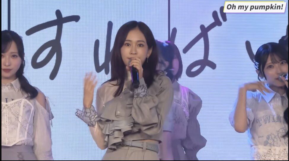 パンツルックの衣装で、センター小栗有以の隣で表題曲を披露し、笑顔を見せていた。