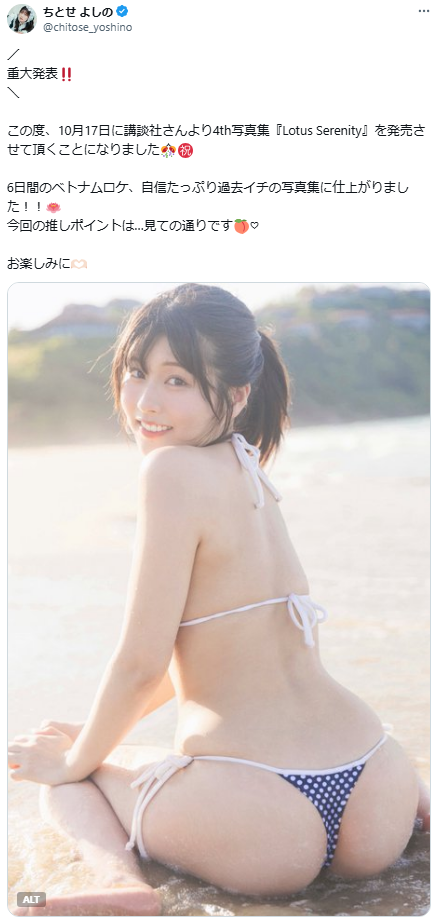 元鉄工所勤務のグラビアアイドルで、TBS「モニタリング」などで大食いタレントや、アイドルグループ「あまいものつめあわせ」のメンバーとしても活躍する“Hカップの有村架純”こと、ちとせよしの(25歳Hカップ)。2025年10月17日に4th写真集「Lotus Serenity」を講談社から発売することが発表されました。