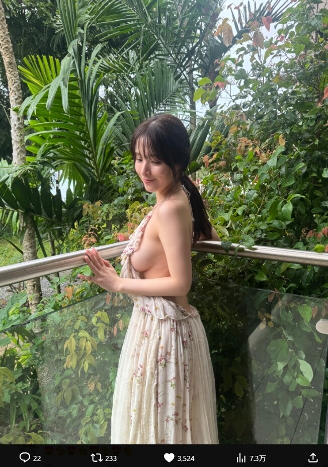 発売に先駆け、素肌にワンピースで横乳を大胆に露出したオフショットが本人の公式X(旧Twitter)で投稿され、ファンから興奮の声が殺到していました。