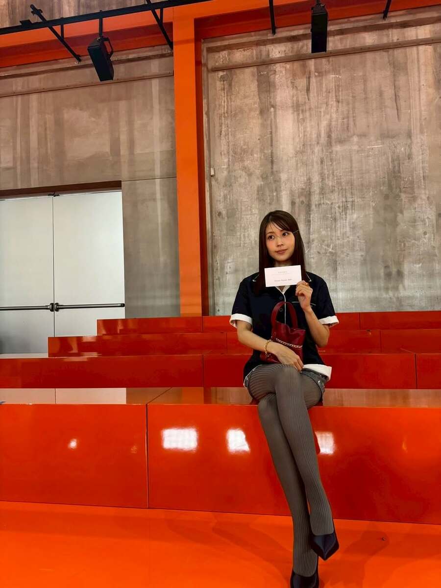 2026年春夏のPRADAのミラノコレクションを訪れている有村さん。鮮やかなオレンジ色の椅子にグレーのタイツ姿で足を組んで座り、長く細い美脚が際立っています。