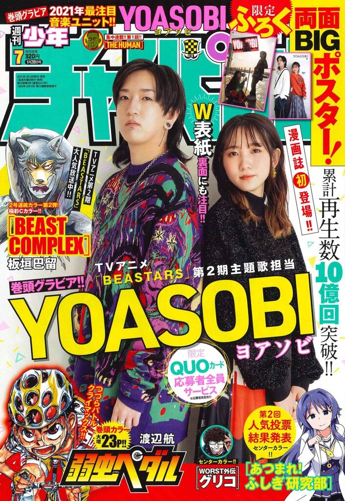 大ヒット曲「夜に駆ける」でNHK紅白歌合戦初出場を果たした、音楽ユニット「YOASOBI」の女性ボーカルikura(本名:幾田りら=20歳)と男性プロデューサーのAyase(26)。2021年1月14日発売の「週刊少年チャンピオン」で表紙を飾り、巻頭グラビアを披露しました。
