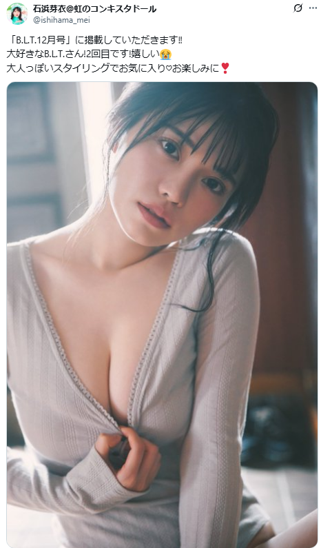 アイドルグループ「虹のコンキスタドール」のメンバーで、グラビア界でも引っ張りだこの石浜芽衣(23)が、2025年10月28日発売のグラビアムック「B.L.T. 2025年12月号」で、水着グラビアを披露することがわかりました。