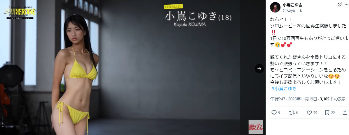 週刊プレイボーイの公式YouTubeでは、ファイナリスト7名のソロメイキングムービーが投稿されましたが、ビキニ姿で見せた圧倒的なスタイルが話題となり、桁違いの再生数を記録していました。