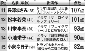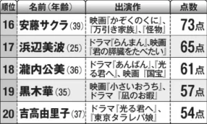 ここ最近、演技派女優との呼び声も高い河合優実(24歳)は2位。前作の朝ドラ『あんぱん』で今田美桜(28歳)演じるヒロインの妹役を演じ、好評を博した。