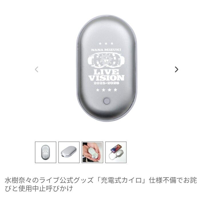 「2025年10月28日(火)より通販サイト「mono stand」にて販売しておりました『NANA MIZUKI LIVE VISION 2025-2026』のオフィシャルグッズ「VISION☆充電式カイロ」において、使用中に異常な発熱が発生した事象が確認されました」と報告。