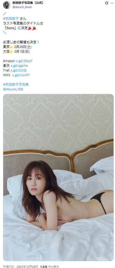 AKB48の“絶対的センター”と称され、時代を象徴する国民的アイドルとして人気を博し、現在は俳優として新たな道を歩んでいる前田敦子(34)が、2026年2月16日、約14年ぶりに過去最大露出に挑戦したラスト写真集「Beste」を発売します。