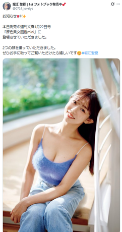発売当日、本人の公式X(旧Twitter)では、美谷間を見せつつ爽やかな陽射しが差し込むカットが投稿され、ファンから歓喜の声が寄せられていました。