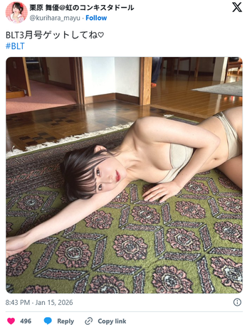 アイドルグループ「虹のコンキスタドール」のメンバーで、あざとさを武器にすることから“ポスト田中みな実”と称される栗原舞優(24)が、2026年1月15日、自身の公式X(旧Twitter)を更新。28日発売予定の雑誌「B.L.T.2026年3月号」で披露する水着グラビアのオフショットを投稿すると、久々のグラビアにファンから歓喜の声が寄せられていました。