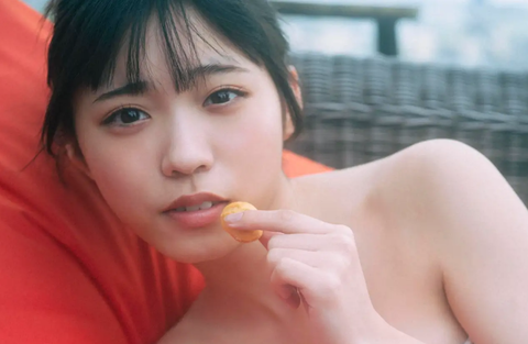発売に先駆け、4着目の水着カットが解禁されました。初めてのチューブトップビキニを着用し、台湾の国民的おやつ「義美小泡芙(イーメイ・シャオパオフー)」を手に持つ姿にファンから歓喜の声が殺到していました。