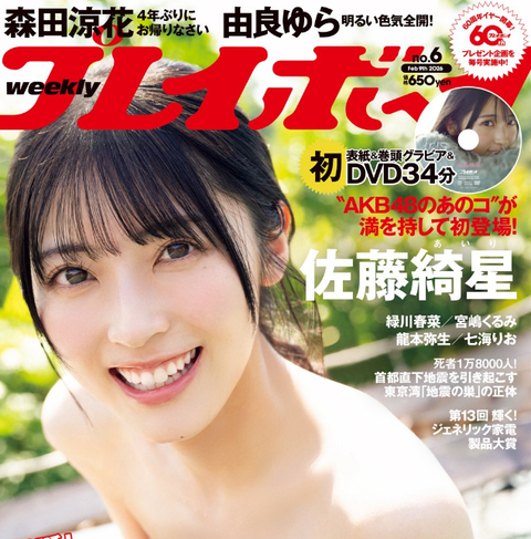 シングル曲でセンター経験のあるAKB48の次世代エース・佐藤綺星(あいり=21歳)が、2026年1月26日発売の雑誌「週刊プレイボーイ」で、初表紙&巻頭グラビアを飾りました。