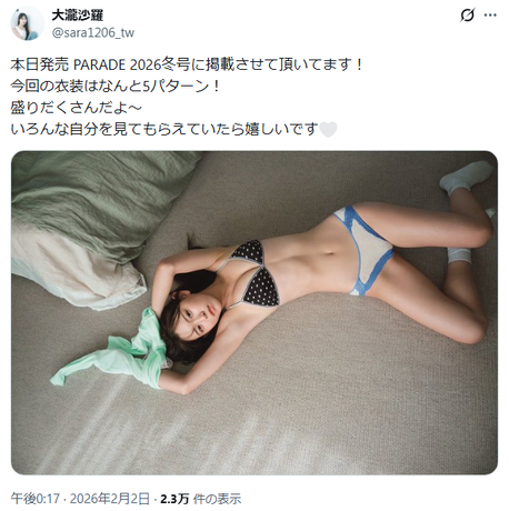 キュートな童顔フェイスに高身長の抜群スタイルという唯一無二のギャップを武器に、“衝撃のベビーフェイス”のキャッチフレーズでグラビアデビューして以降、誌面を席巻している大瀧沙羅(21)が、2026年2月2日発売のムック本「PARADE 2026冬号」で、水着グラビアを披露しました。