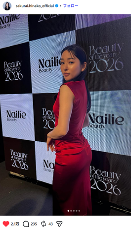 “岡山の奇跡”こと女優の桜井日奈子(28)が、2026年2月6日、自身の公式Instagramを更新。「Beauty of the year 2026のヘア部門を受賞させていただきました」のコメントとともに、授賞式で着用したドレス姿のオフショットを投稿すると、ヒップラインが浮き出たセクシーショットにファンから興奮の声が殺到していました。