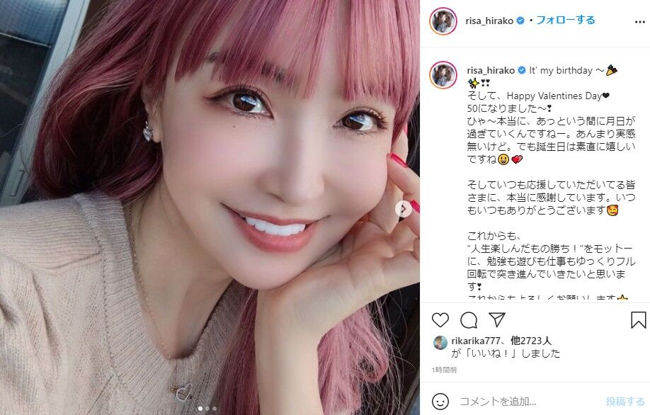 今回の投稿には「It’smybirthday〜そして、HappyValentinesDay50になりました〜ひゃ〜本当に、あっという間に月日が過ぎていくんですねー。あんまり実感無いけど。でも誕生日は素直に嬉しいですね」などとつづり、誕生日を迎え50歳になったことを報告しつつ、濃いめのピンク色のヘアカラーに染めた自身の写真を披露している。