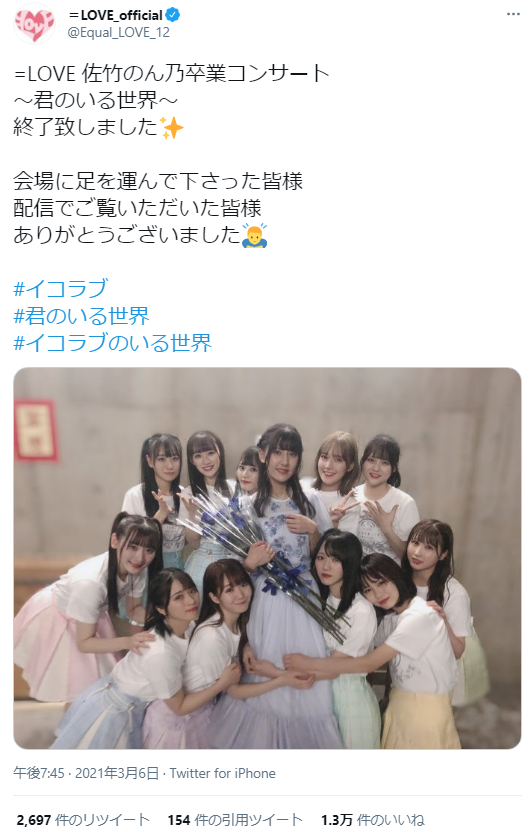 (「=LOVE」公式Twitterより、佐竹のん乃の卒業コンサート後の写真)