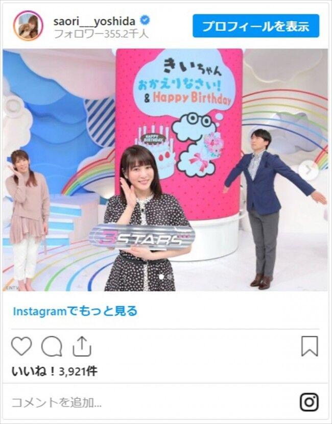 12日の放送後に桝アナが「#おかえりなさい」と投稿したのは、北乃と撮影した番組のオフショット。北乃を中央に桝アナと金曜日パーソナリティーの吉田沙保里がZIP!ポーズを見せる3ショットや、北乃と桝アナがユーモラスなポーズを見せる写真が披露されている。