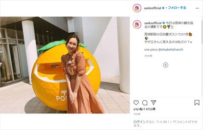 宮崎県出身の紗栄子はこの日、「今日は宮崎の観光協会の撮影です」「宮崎駅前の日向夏ポストでの1枚」と綴り、宮崎県特産果実の日向夏をイメージした大きな郵便ポストの前で微笑むオフショットを披露。続けて「サザエさんに見えるのは私だけ?w」とコメントし、確かに国民的アニメ「サザエさん」のオープニングで果実からサザエさんらが登場するシーンを彷彿とさせる写真となっている。