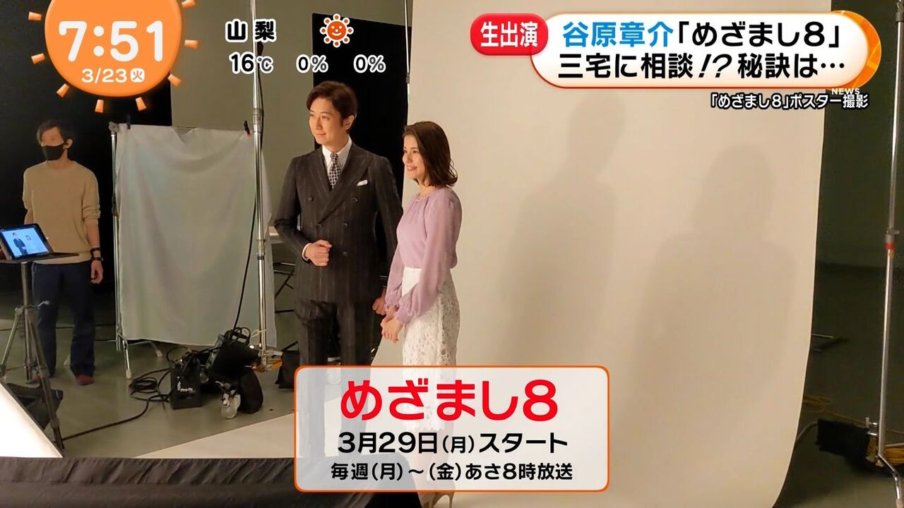 フジテレビの平日朝の新情報番組「めざまし8」が29日、スタートした。小倉智昭の司会で22年間続いた「とくダネ!」の後を受け、俳優・谷原章介と永島優美アナが、ホワイトとブルー主体の五輪中継のような明るい色彩のスタジオから、さわやかに伝えた。