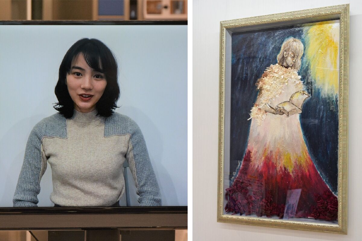 ビデオレターで作品への思いを語る、のんさん(左)と久慈市情報交流センター「YOMUNOSU」に展示された、のんさんの作品
