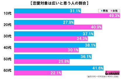 それに比べて男性は、60代が一番恋愛対象が広いことが分かりました。