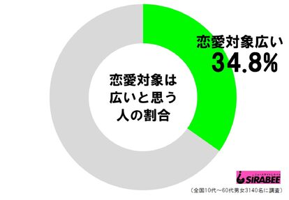 まずは、しらべぇ編集部が全国10~60代の男女3,140名を対象に調査してみました。すると…全体の34.8%が「恋愛対象は広いと思う」と回答しました。約3人に1人という割合ですね。