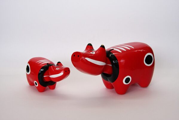 赤に下塗りした牛の型に、黒の斑点と白の縁取りがデザインされた「赤べこ」。丸みを帯びた頭部がこくりこくりと動くことから「可愛い」と愛される一方で、厄除けのお守りや縁起物としても知られている。