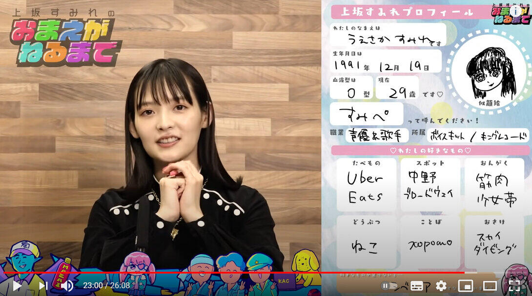かつて流行した「プロフィール帳」に似せて自己紹介をしていく中で「生年月日は1991年12月19日です。もうちょっとするとねソ連邦が崩壊してゴルビー(ゴルバチョフソ連大統領)が追放されたり悲しい出来事がありますね」と話した上坂さん。好きな食べ物は特定の食品ではなく、飲食宅配サービス「Uber Eats」をあげた上で、「なんで自炊せなあかんねん。自炊の何がおもろいねん」とほとんど自炊をしないことも暴露した。