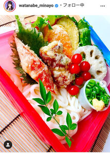 渡辺はブログで「朝一から天ぷら揚げてます」と報告し、「今日の名月のお弁当!冷やし天ぷらうどん 昨日見た天気予報で暖かくなるとの事だったので今年初!!」と説明。天ぷらの具は「さつまいも 蓮根 カニカマ 人参 大葉 竹輪」と明かした。