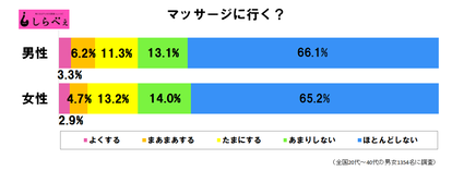 ちなみにしらべぇ編集部が全国の20~60代の男女1,354名を対象に「マッサージに行く」頻度について調査したところ、「あまりしない」13.5%と「ほとんどしない」65.7%で、「マッサージには行かない」派が79.2%という結果になった。
