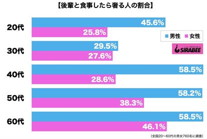 しらべぇ編集部が全国20~60代男女760名を対象に調査を実施したところ、全体の43.2%が「後輩と食事をしたら奢る」と回答。