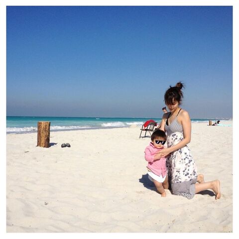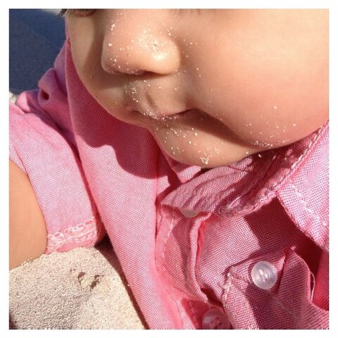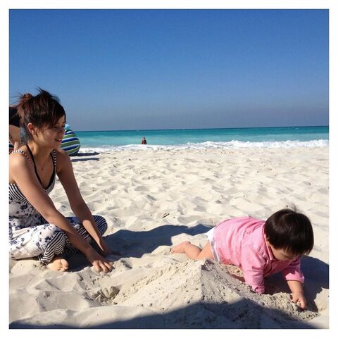 白い砂浜と青い海をバックに、息子と2ショットで写った加藤さん。息子にとっては初めての海だったようですが「息子が砂を食べる食べる…2枚目の写真なんて私若干引いちゃってる。。。」と、なぜか味覚で満喫してしまったようで、口の周りを砂だらけにした写真も公開しています。