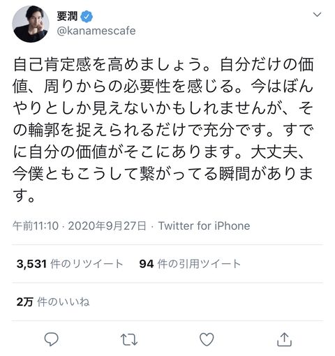 自己肯定感を高めましょう。自分だけの価値、周りからの必要性を感じる。今はぼんやりとしか見えないかもしれませんが、その輪郭を捉えられるだけで充分です。すでに自分の価値がそこにあります。大丈夫、今僕ともこうして繋がってる瞬間があります。