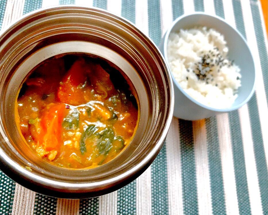 目を引くのは白米と並ぶスープジャー。新購入した保温、保冷弁当箱で、「やはり重たいし、かさ張りますが毎日のお弁当なのでたまの楽しみには良さそうですね」と、期待を寄せた。