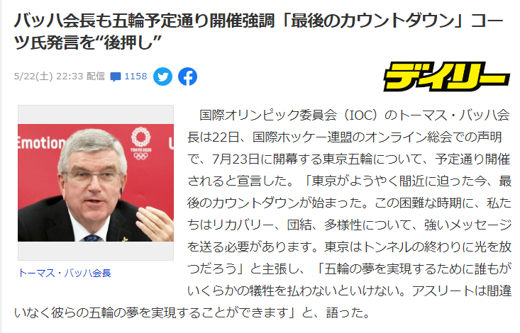 バッハ会長の発言の英文を翻訳した記事の要約、2chの反応をまとめました。
