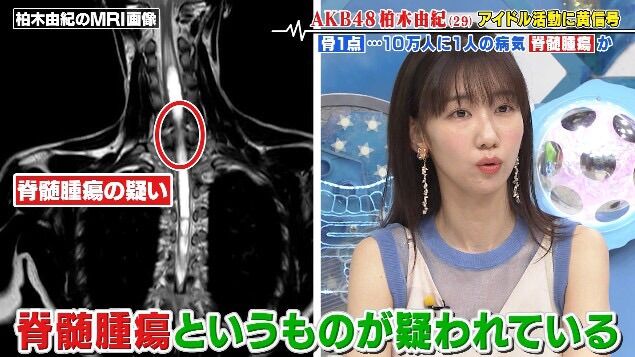 番組では磁気共鳴画像装置(MRI)検査の結果、「脊髄腫瘍」の疑いがあるとされた。