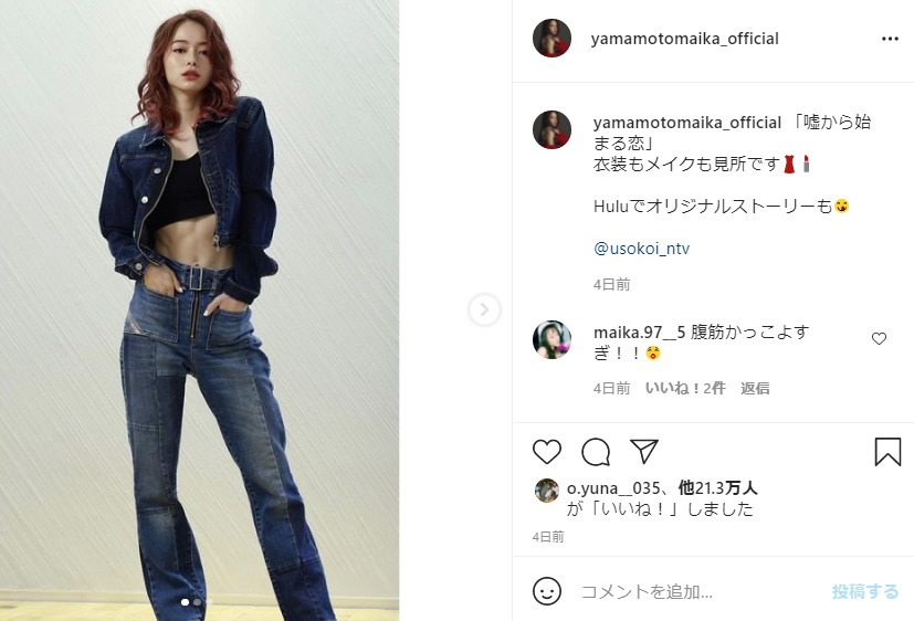 女優でモデルの山本舞香(23)が、2021年7月1日、自身のInstagramを更新。ドラマ「嘘から始まる恋」でカリスマショップ店員役を演じた際の衣装写真を投稿すると、バッキバキの腹筋がファンから「カッコ良すぎる」と大絶賛されていました。